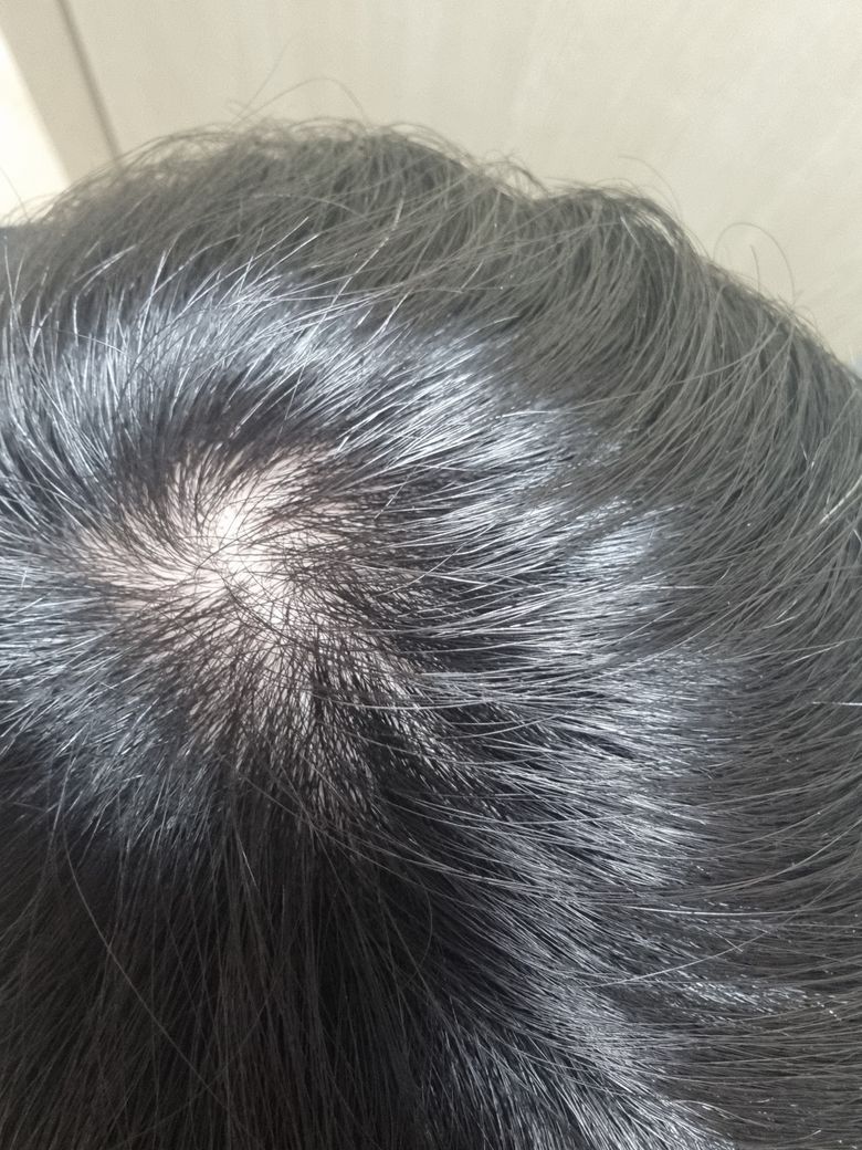 육안으로 보기에 모발이 가늘어지는 부분이 명확하게 보이지는 않는 것 같지만 정밀한 진찰이 필요하겠으니 남성형 탈모가 걱정스러우시면 가까운 피부과를 방문해보시기 바랍니다. 또, 원형탈모는 정수리의 모발이 빠지는 상황을 의미하는 질환은 아닙니다.
