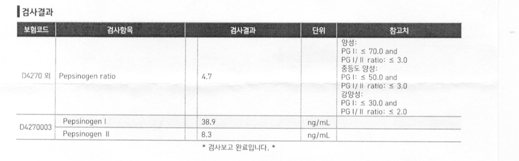 속쓰림이 1년이상 지속되서 건강검진에서 펩시노겐 검사한건데 해석좀 부탁드려요!