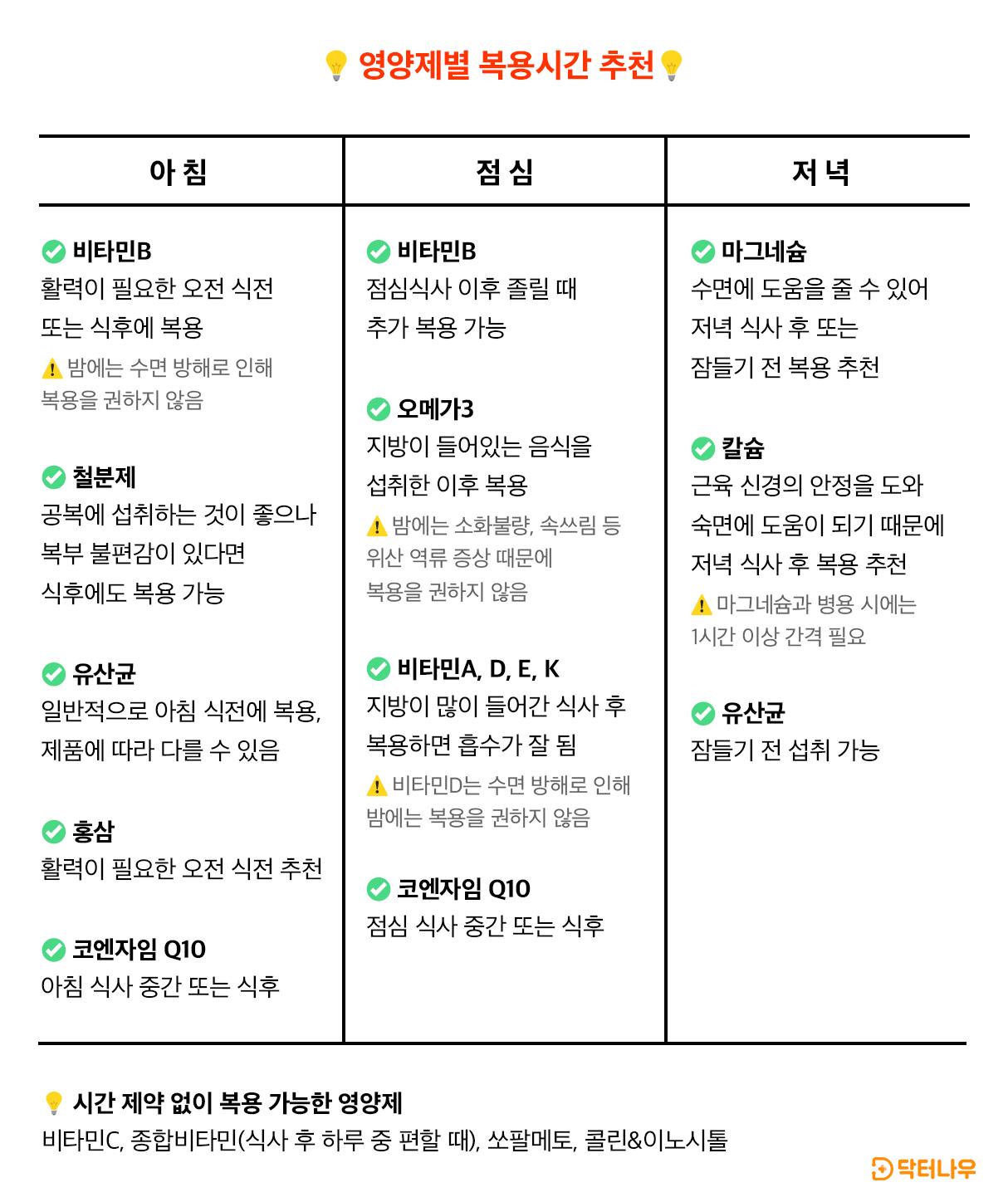 가능하다면 아래에 있는 표에 맞춰서 본인이 복용하고 있는 영양제를 맞춰서 복용하면 좋긴 하겠지만 그것이 꼭 무조건적인 기준은 아니기 때문에 번거로우실 경우에는 편한 시간대에 영양제를 복용하셔도 괜찮습니다.