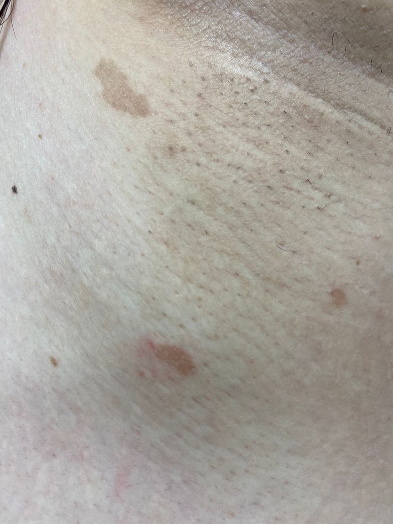 아래쪽은 뭔가 불안해서 긁었더니 빨갛게 된것입니다. 원래는 위에 큰 색소침착같은 색이였습니다.