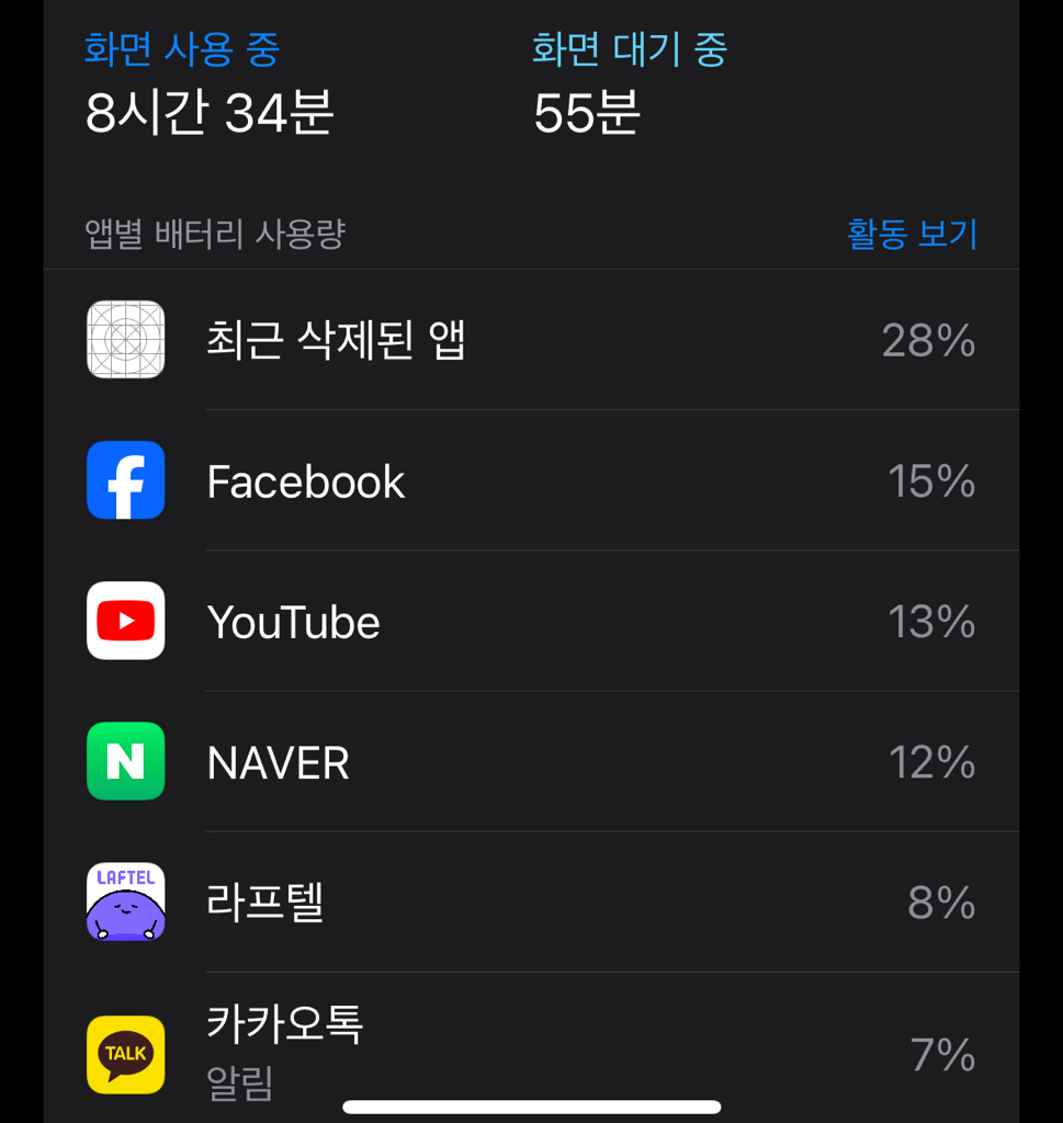 휴대폰 배터리 사용량 볼려고 봤는데 요렇게 떠 있더라고요 .. 삭제된앱 시간으로 보니깐 40분으로 떠 있던데