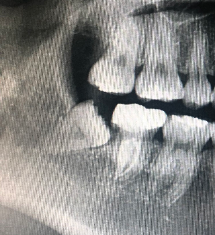 사랑니가 경사져 매복되어 있습니다. 이런 경우 사랑니를 부셔 간단한 수술을 통해 발치해야 합니다.