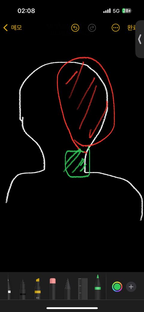 뒷목(그림에서 초록색부분)이 땡기고 오른쪽 뒤통수(그림에서 빨간색 부분)이 저리듯 찌릿찌릿하는 느낌이 들어요. 웃을 때마다 가슴(그림에서 노란색 부분)이랑 어깻죽지에도 근육통처럼 통증이 있어요. 원래 일자목에 라운드숄더와 버섯증후군도 심합니다... 혹시 자세교정하면 괜찮아질까요?