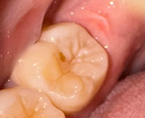 충치로 인해서도 구멍이 생길수 있으며, 현재 사진상 충치가 발생한 것으로 보입니다. 이 경우 빠른시일내에 치과 진료를 받고 치료를 받길 권합니다.
