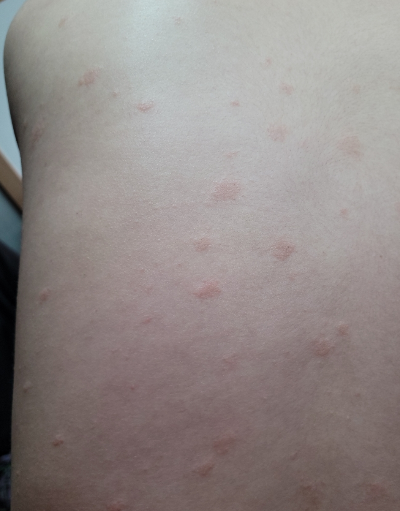 현재로서는 두드러기를 감별하는 것이 좋겠습니다. 두드러기는 다양한 원인에 의해 발생하며 증상 발현시 항히스타민제를 복용하면 증상이 완화되지만 원인을 회피하는 것이 근본 대응법입니다. 그러므로 정확한 진단을 위해 피부과 혹은 알러지 내과에 내원해 보시는 것이 좋겠습니다.
