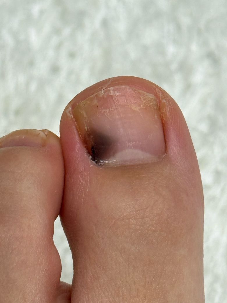 사진의 소견만 놓고 보았을 때에는 단순히 발톱 아래의 멍, 즉, 조갑하혈종으로 보입니다. 흑색종이 손톱 또는 발톱 등에 생길 때에는 손발톱의 결을 따라서 세로 모양의 직선으로 발생하게 되는데, 그러한 소견으로 보이지 않습니다. 그렇지만 너무 걱정되고 우려스럽다면 피부과에서 한 번 구체적으로 진료 및 검진을 통한 상태 감별 및 진단을 받아보시는 것도 도움이 될 수도 있겠습니다.
