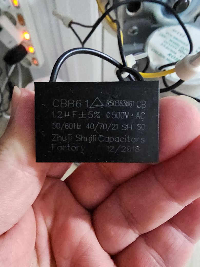 그래서 분해해봤더니 아래 사진과 같은 콘덴서가 들어있네요. CBB61 1.2uf 500V