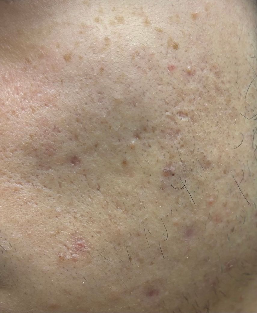물어보신 피부 병변들은 여드름 흉터가 맞습니다