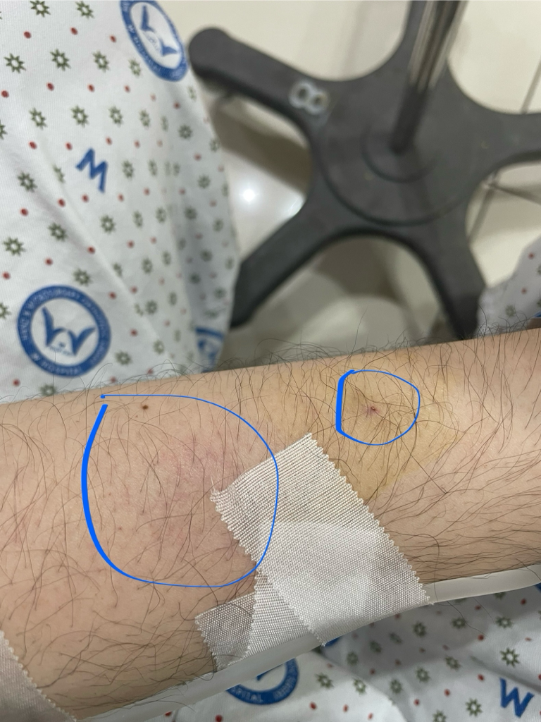 동그라미 친 부분과 주사를 맞는 팔을 살펴보면 감염증이 전혀 없습니다. 또한, 평소 면역저하자가 아니라면 이러한 일상적인 처치로 패혈증이 발생한다는 것은 거의 불가능한 수준이라 볼 수 있습니다.