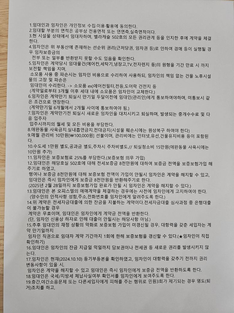 전체적으로 크게 문제될 부분은 아니나 조금 불리해 보일수 있는 특약 항목은 10번 퇴실청소비와 19번 소음 민원시 계약해지등으로 보입니다. 19번의 경우는 사실 조금 난해한 부분이 있다 판단됩니다.