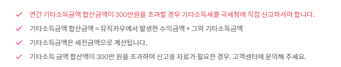 2. 기타소득은 건당 소득금액이 5만원을 초과할 경우 22%를 원천징수합니다. 건당 소득금액이 5만원 미만일 경우 소득세가 과세되지 않습니다. 손해를 볼 경우도 마찬가지일 것입니다. 뮤직카우의 경우, 기타소득의 각 건마다 상계하는 개념은 아닐 것으로 보여집니다. 질문자님의 예시를 본다면 종합소득세 신고대상 기타소득금액은 400만원입니다.