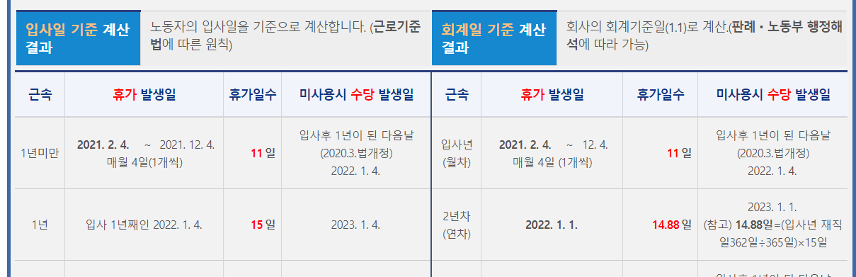 >> 회계연도 기준(매년 1.1)으로 연차휴가를 부여할 경우 2021년도에 발생하는 연차휴가는 1개월 개근시 1일씩 발생하는 월단위 연차휴가 11일이며, 2022.1.1에는 14.88일이 발생합니다(15일*362일/365일).