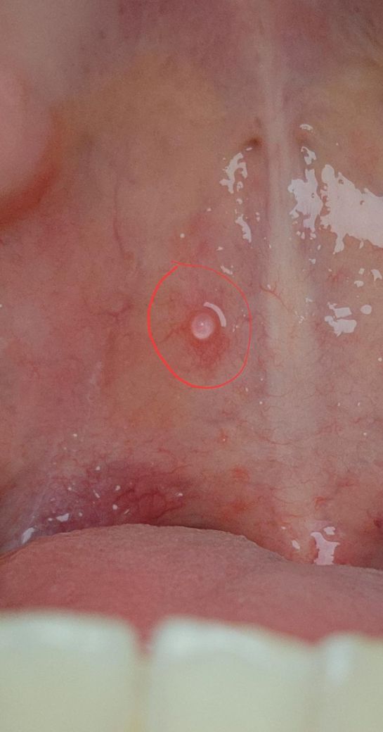 사진속에 보이는 입천장(목구멍 근처)에 하얀색 동그란게 생겼는데 무엇일까요~? ㅠㅠ..
