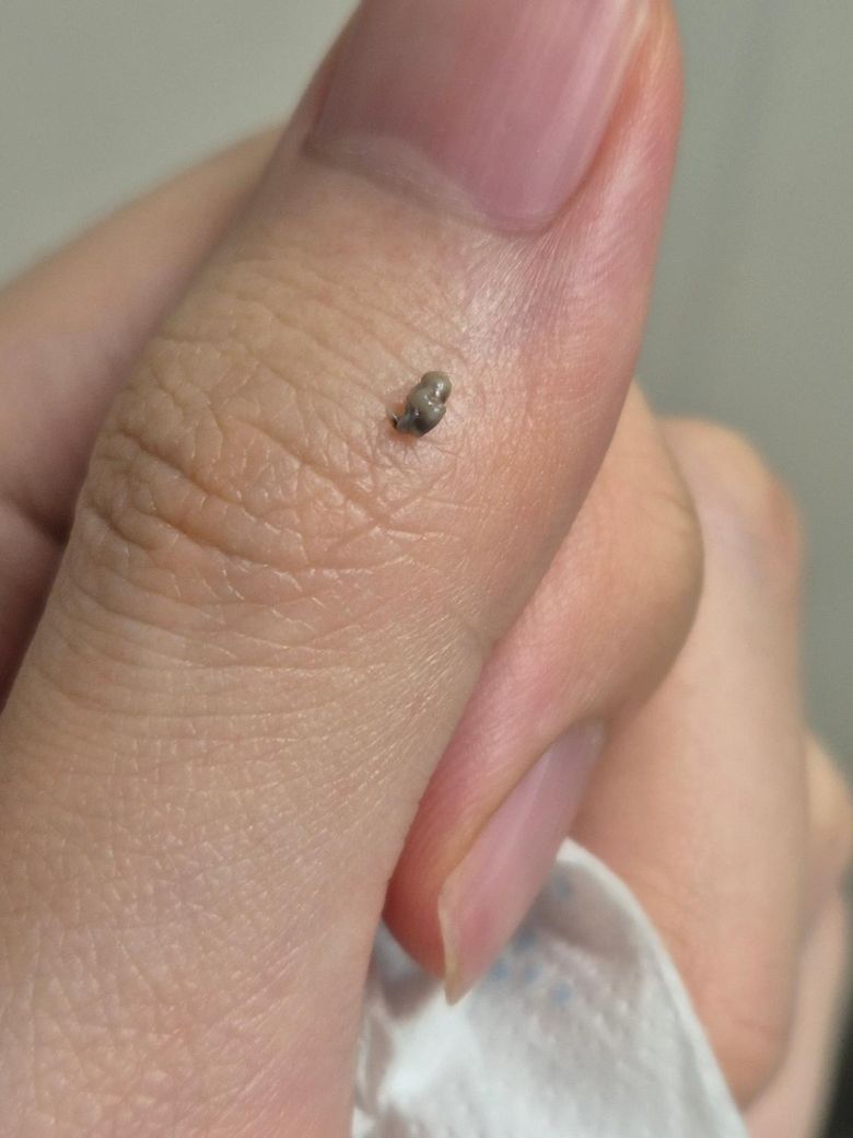 이렇게 피가 나오고 있는 상태였습니다 과산화수소수로 소독하고 후시딘을 발라놓았고 며칠 뒤 지금 안쪽이 단단하게 만져지길래 한번 짜봤더니 피와 함께 팍 하고 튀더니 이런게 나왔습니다