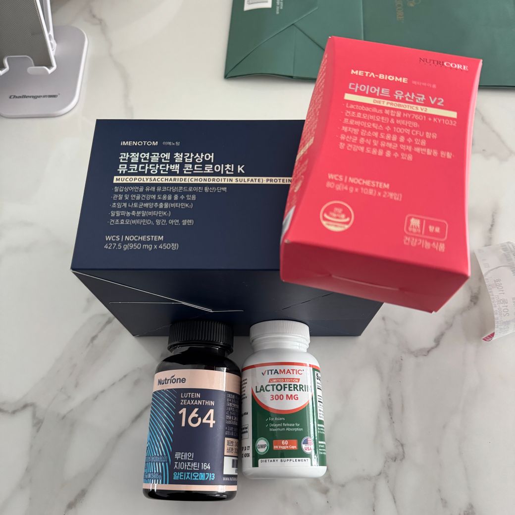 락토페린과 다이어트 유산균을 아침 공복에 복용해주시고 콘드로이친과 루테인은 식후 복용하는것을 권장드립니다. 모두 상호작용이 보고되지 않았으므로 용법만 지켜서 복용하시면 됩니다.