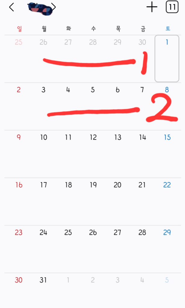 우리나라는 한주의 시작은 월요일로 통상적으로 취급합니다. 따라서 첫번째사진은 3일. 두번째사진은 5일이 첫째주로 보시면 됩니다