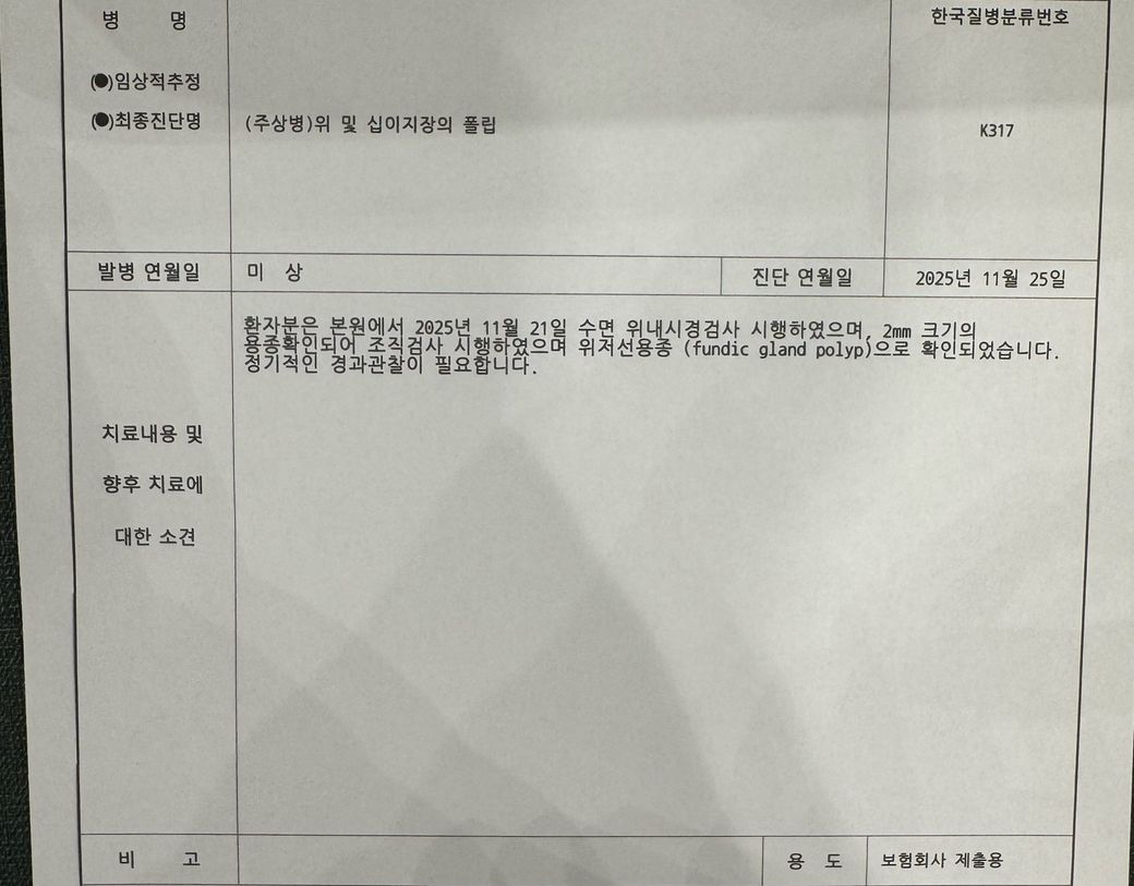 더불어 보험전문가로써 한 말씀드리면, 위저선용종 k317 2mm크기라서 현재는 상관없는듯하나, 위나 대장에서 크기가 2cm정도로 큰 용종이나 선종이 있거나 갯수가 많거나 할 때마다 발견되신다면 향후 돈이 좀 아깝더라도 조직검사결과지를 발급해서 유사암으로 청구 될 가능성은 없는지 확인해보시는게 좋습니다.