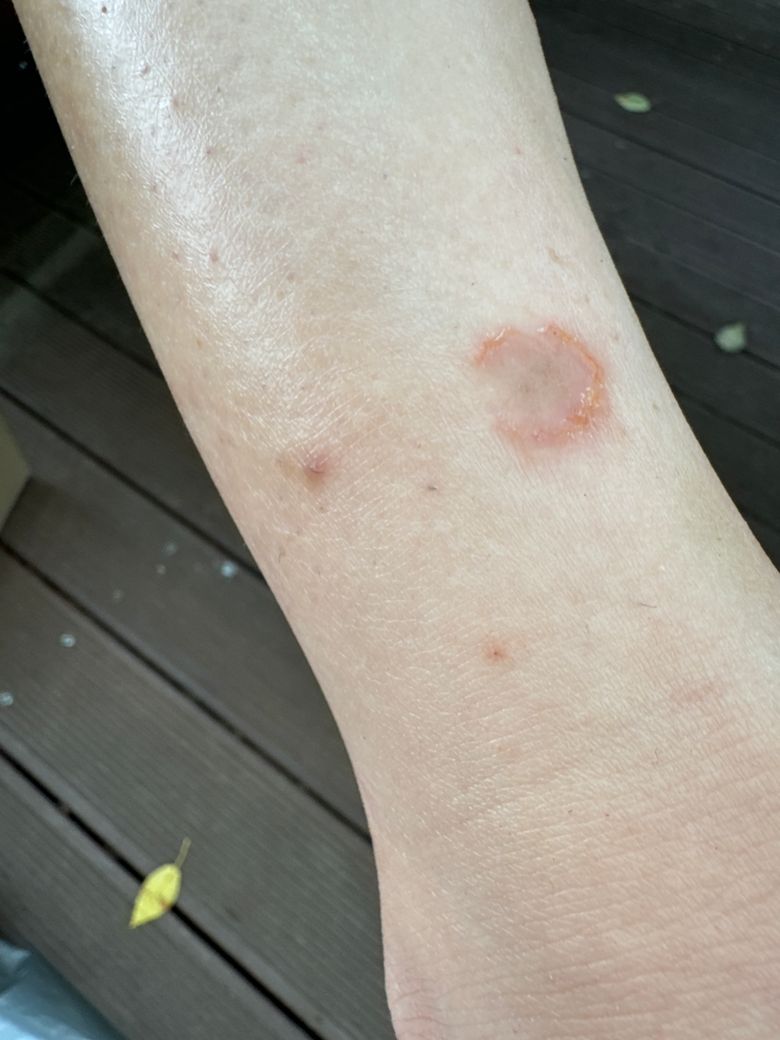 피부에 발생한 무좀입니다. 병원에 가셔서 무좀연고를 처방 받아서 2주 정도 꾸준히 발라보시기 바랍니다. 약을 먹으면 더 잘 낫지만 약이 독할 수 있으니 연고부터 먼저 사용해 보시기 바랍니다