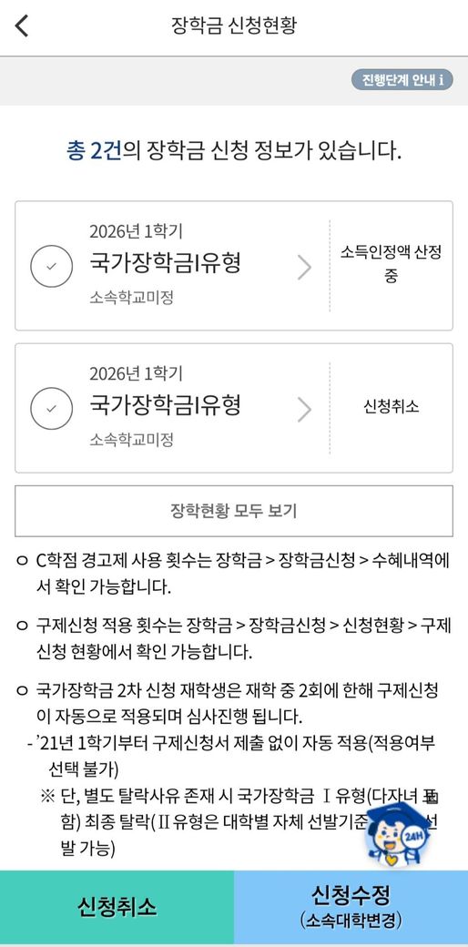 장학금 신청 다 하고 보니 전자문서 지갑 불러오기라는게 있는데 이거 해야하나요? 그리고 제가 신청 할때 학교 미정으로 했는데 1차 마감 전 까지 학교 정해서 설정 바꿔야 하나요? 신청 현황 보면 2개가 떠 있던데 수정 할때 어떤 걸 수정 해야하나요 알려주세요.