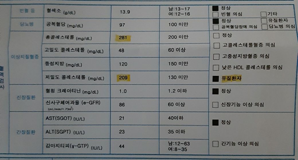 1. 고밀도 콜레스테롤이 높을수록 좋은것이고 총콜레스테롤, 저밀도 콜레스테롤은 낮아야 좋습니다.