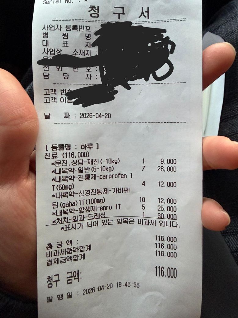 다음날 오전, 인근 병원 오픈시간에 아이를 데리고 직접 내원했더니 곧바로 왔더라면 꿰메지않고 접착이 됐을텐데 아쉽다시며 절단을 권해주셨으나 보호자님이 13살 노견이라 걱정된다며 만류하셔 드레싱 항생제 주사 처방약 4일치까지 받고 3만원 결제하고 왔는데