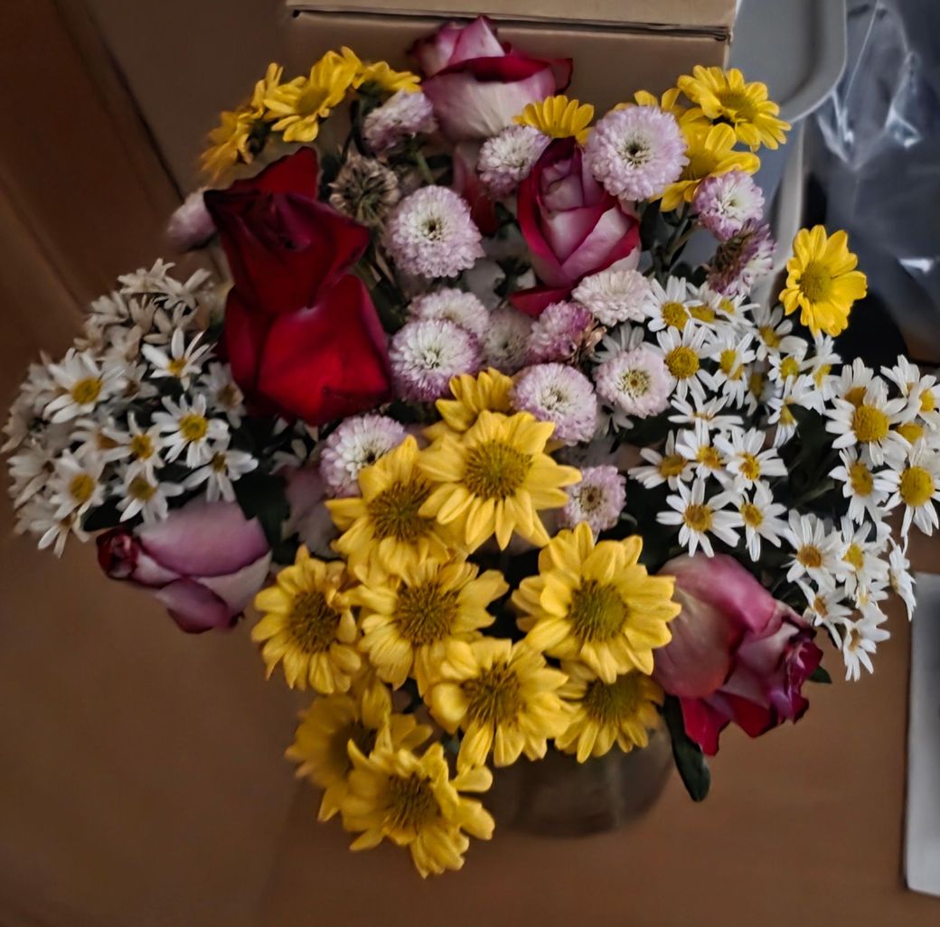 사진 속 꽃은 국화, 거베라, 장미, 리시안셔스 등이 섞인 일반적인 꽃다발이에요.