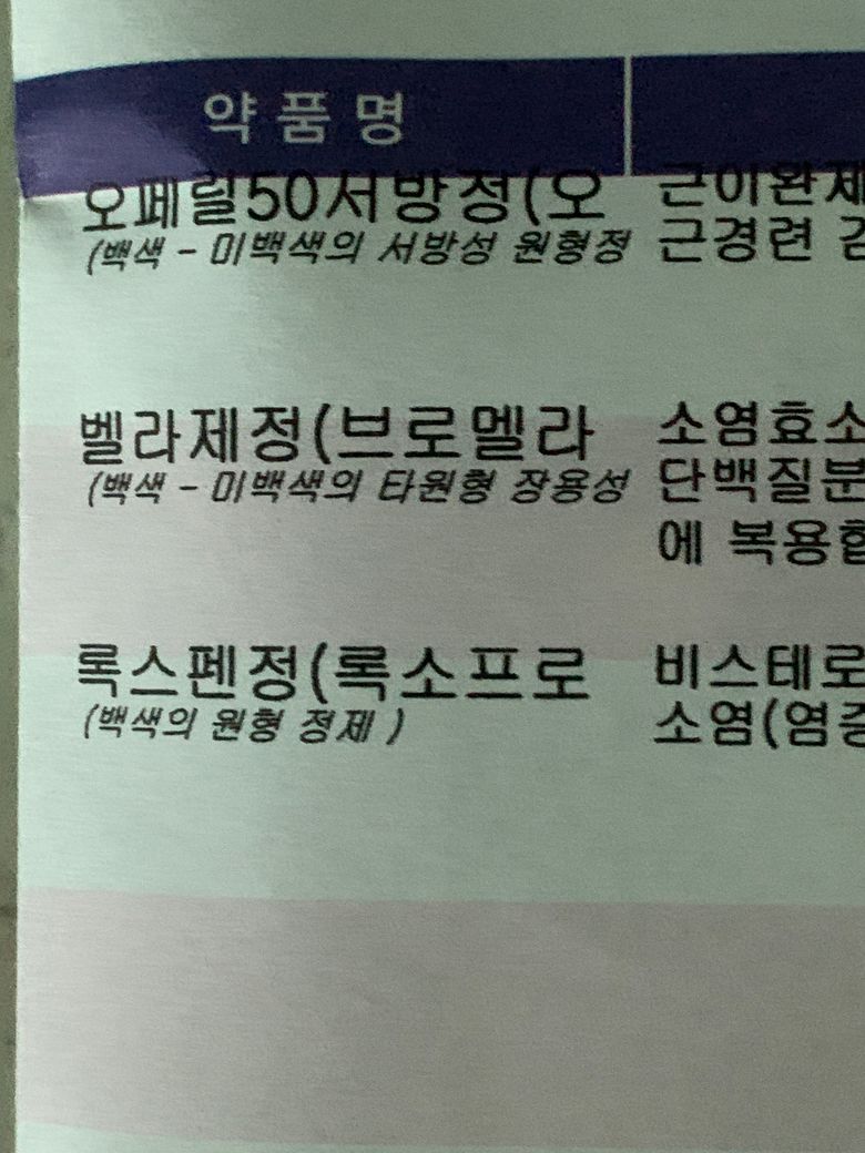 현재 복용하시는 약물 중 오페릴 50 서방정은 오르페나드린시트르산염 성분의 근이완제입니다. 복용시 나른함을 유발할 수 있으며 록스펜정은 사람마다 다르지만 알러지가 있으신분한테는 붓기를 유발할 수 있습니다.