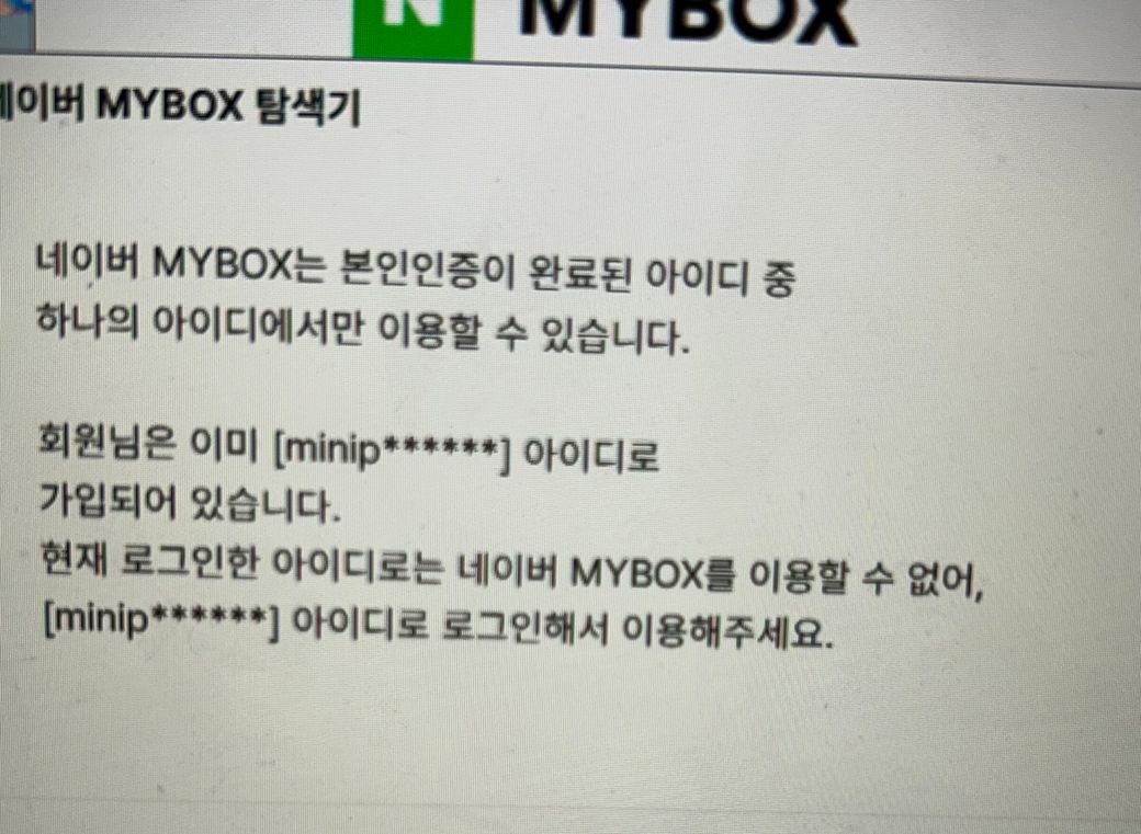 근데 네이버 MYBOX는 본인인증이 완료된 아이디 중 하나의 아이디에서만 이용할 수 있습니다.