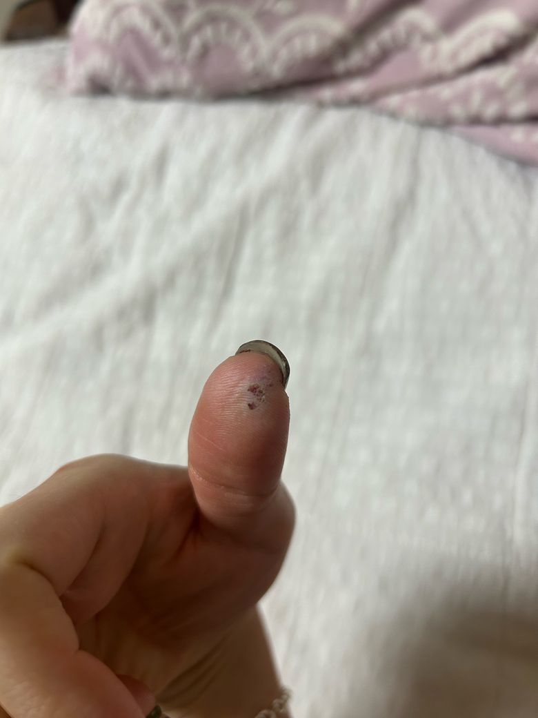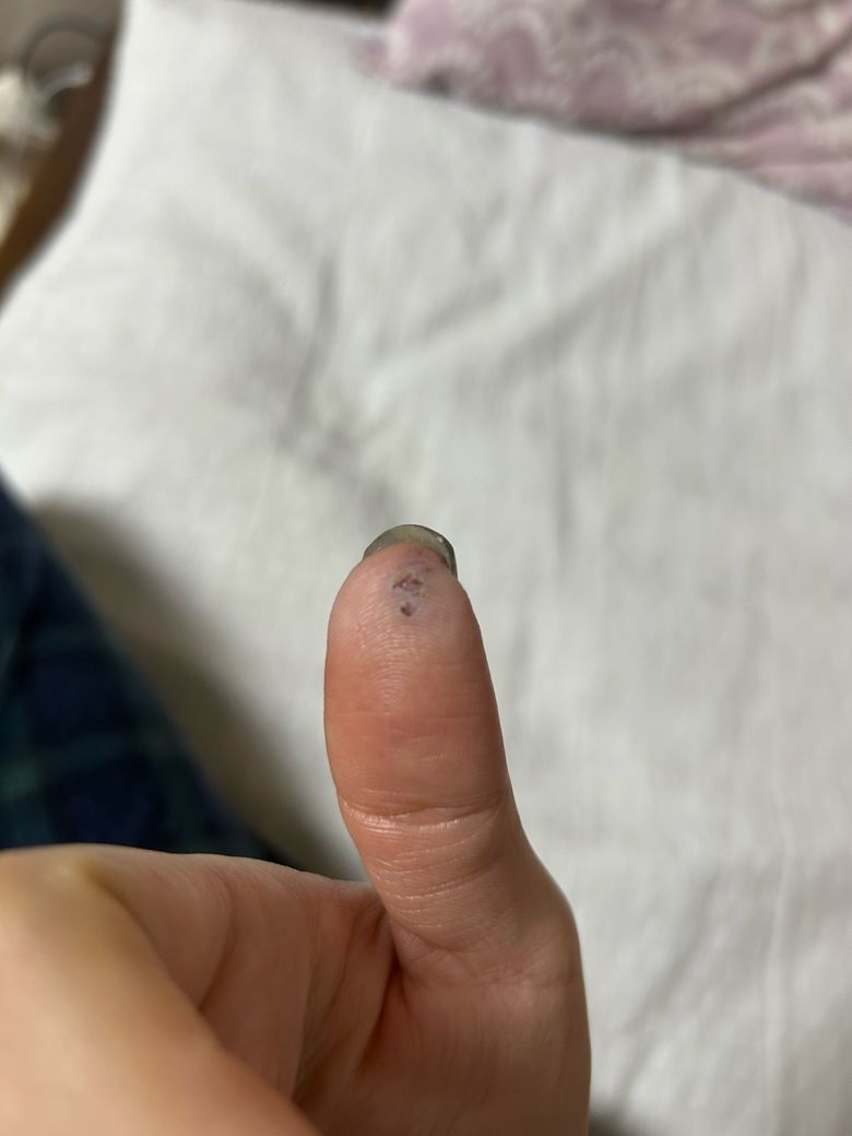 9년전에 치과병원에서 실습할때 환자들에게 사용한 마취 주사를 다 쓴 후 뚜껑을 닫는 과정에서 주사바늘에 몇 번 찔린 후 손가락에 상처가 났습니다. 9년전부터상처가 사라지지않고있습니다. 형태는 구멍이 몇개 생겨있고 피멍처럼 주변이 푸르스름합니다.