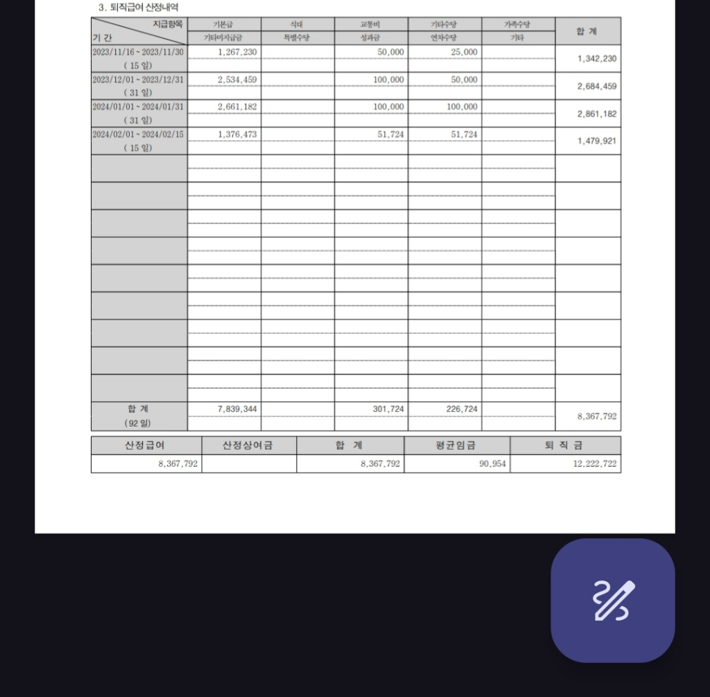 2. 퇴직금과 같이 근로자 퇴사일 기준 최종3개월이 아닌 전체 임금총액의 1/12로 계산을 합니다.