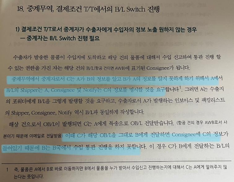 따라서 B/L의 Shipper를 C로 변경하는 경우에는 B/L에서도 A의 존재를 숨길 수 있기에 필요하다고 볼 수 있습니다. 즉, T/T에서는 당초에 수출자가 숨겨지며, B/L의 경우 Switching 을 하여야지 수출자 A의 존재를 숨길 수 있다고 보시면 됩니다.