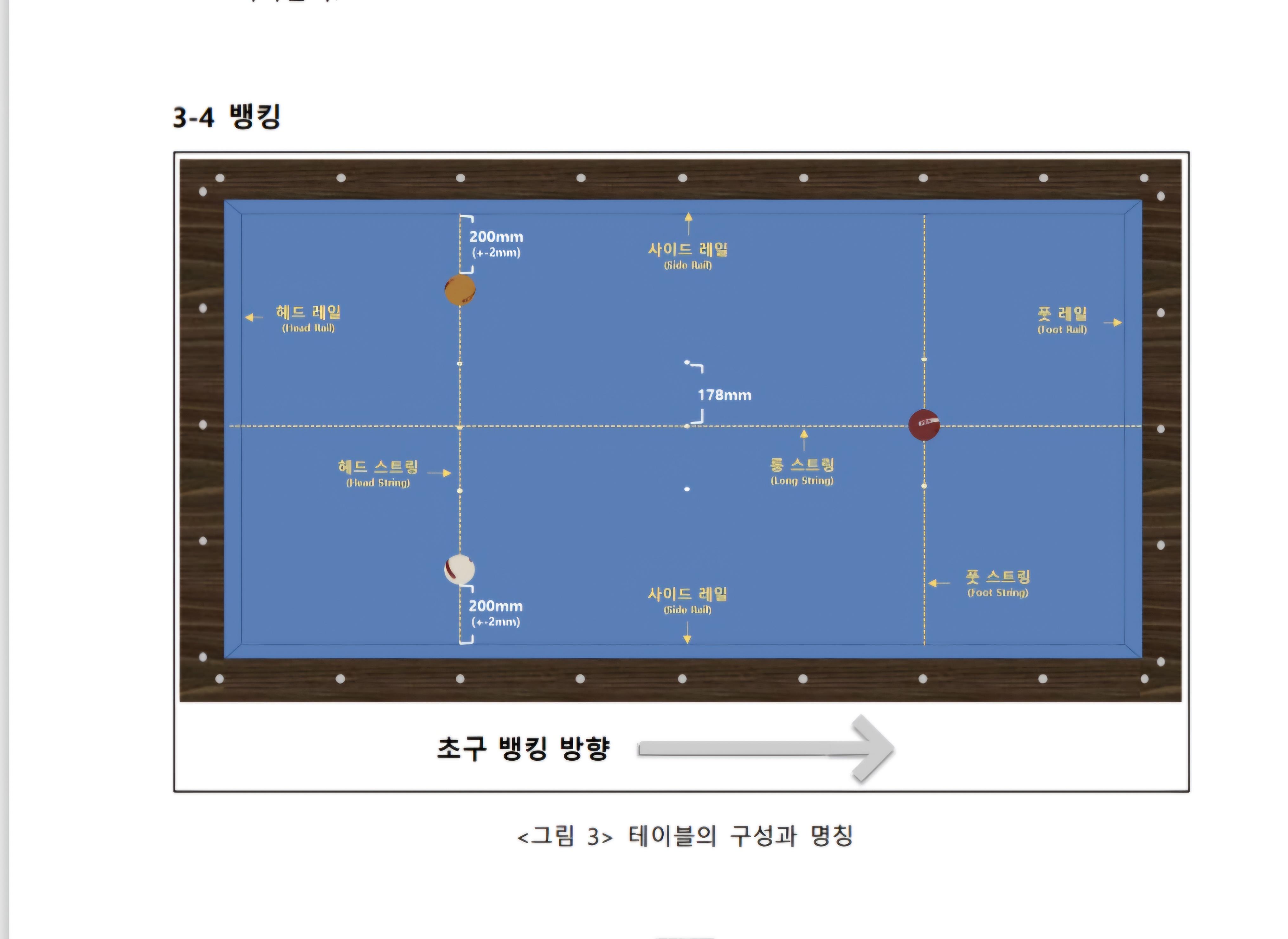 단쿠션-단쿠션 또는 단쿠션-단쿠션-단쿠션으로 진행된 공이 뱅킹자의 반대편 단쿠션 즉 풋 레일에 가깝게 공을 세운 선수가 초구 공격권을 가집니다.
