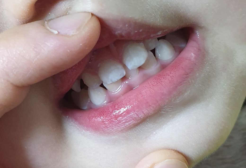 26개월 아기 앞니에 사진처럼 하얀색 무늬 변색된게 보여요 초기 충치 맞나요?