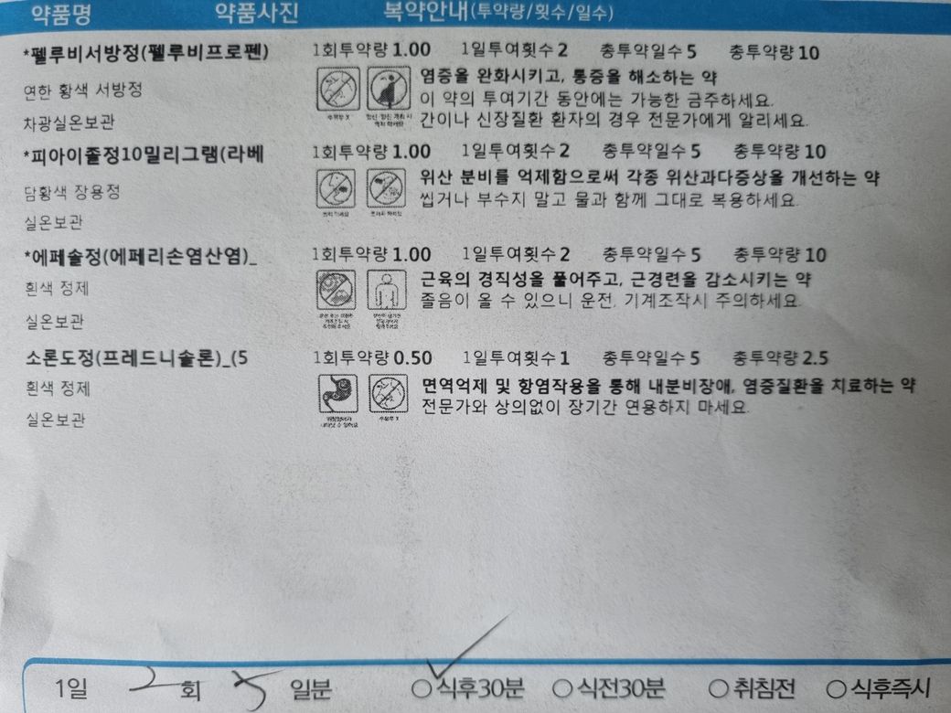 처방받은 펠루비프로펜, 에페리손, 프레드니솔론 등은 일부가 모유로 이행될 수 있어 복용 중에는 수유를 피하는 것이 안전합니다. 약 복용을 중단한 경우, 대체로 24시간 정도 경과하면 체내 약물 농도가 충분히 감소하므로 모유수유를 재개해도 괜찮습니다. 특히 프레드니솔론은 저용량 단기 사용 시 수유 중단 없이도 가능한 약이지만, 안전을 위해 하루는 간격을 두는 것이 좋습니다.