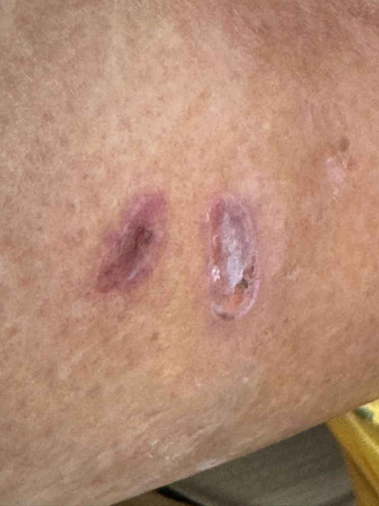 회복 과정에 있는 상처로 보이며, 당장 염증을 의심할만한 발적, 붓기 등 소견들이 보이지 않는 것으로 보아 문제가 있어 보이는 상황은 아닙니다.