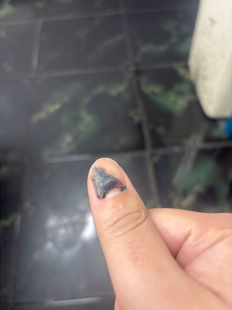 사진처럼 손톱 아래에 피가 고여 압박을 주고있고 이러한 압박으로 인해 손톱이 들려있다면, 손톱이 점차 떨어질 가능성이 높습니다.