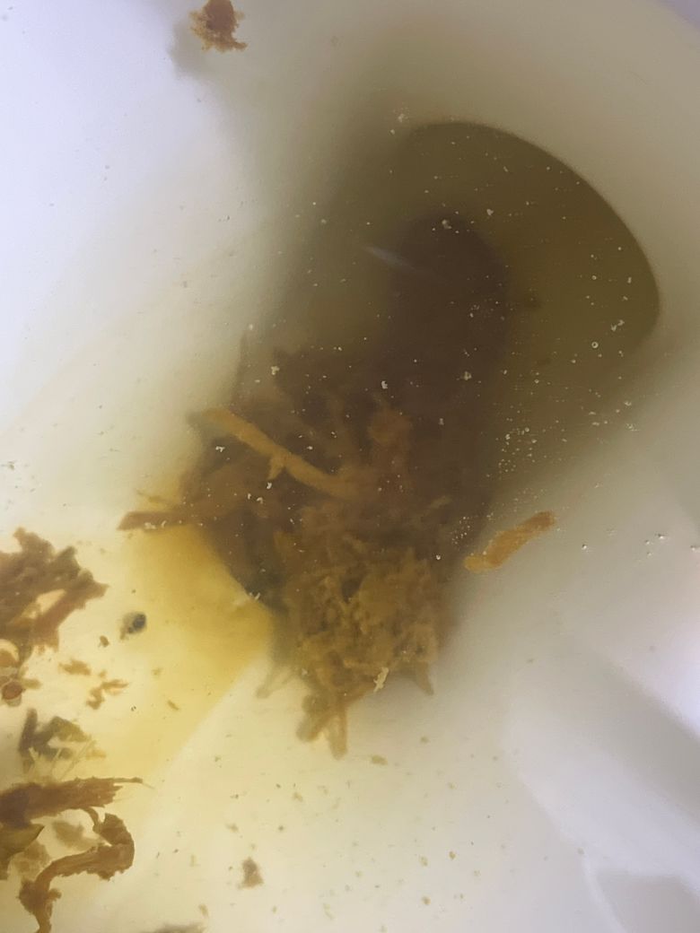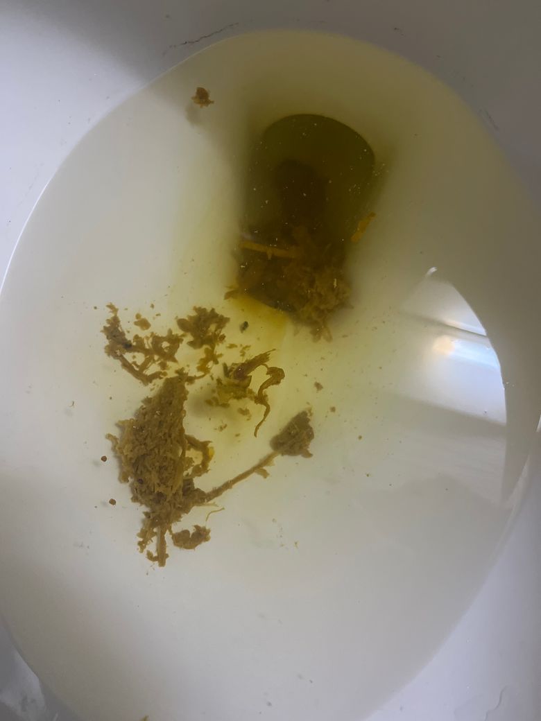 아래 사진은 아주 짧은 대변 이후 뭉치기 전에 풀어진 변이 나옵니다..