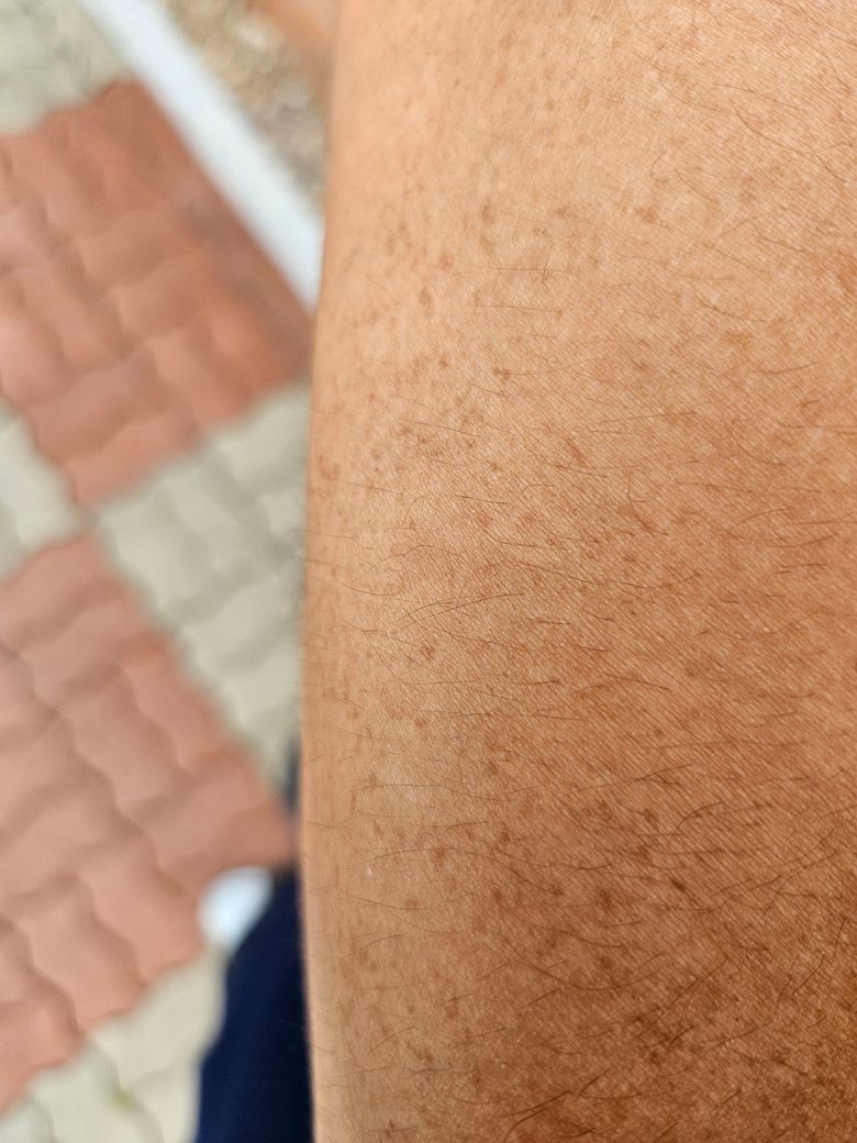 팔뚝에 햇빛을 많이 받은 부위 위주로 멜라닌색소에 의해 잡티가 많이 올라온 상태로 보입니다.