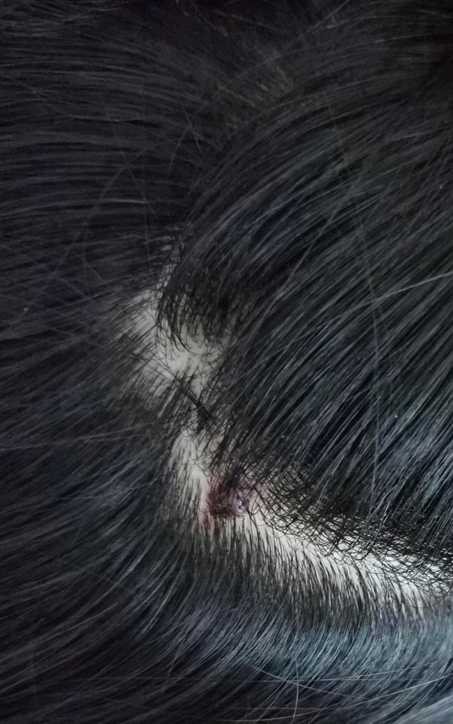 사진과 병력(두피, 수년간 지속, 최근 통증 및 출혈, 일부 연성 촉감)을 종합하면 표피낭종이나 모낭 유래 낭종이 가장 가능성이 높습니다. 특히 두피에서는 모낭에서 기원하는 낭종이 흔하며, 평소에는 무증상으로 지내다가 염증이 생기면 통증, 발적, 압통, 출혈이 나타나는 경과를 보입니다. 말씀하신 “짜지지 않는다”, “속이 약간 물렁하다”는 점도 낭종의 전형적인 특징에 부합합니다.