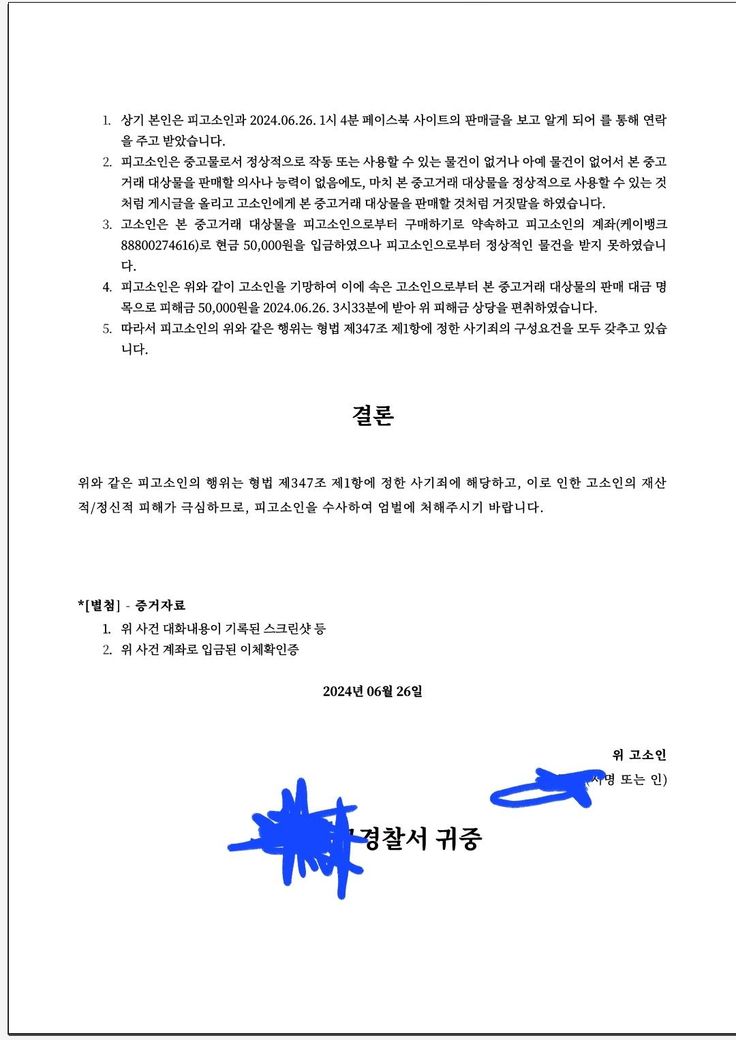 안녕하세요. 김성훈 변호사입니다. 위 첨부된 사진에 기재된 고소장 내용으로 충분하다고 보여 이를 인쇄하여 경찰서에 제출하시면 되겠습니다.