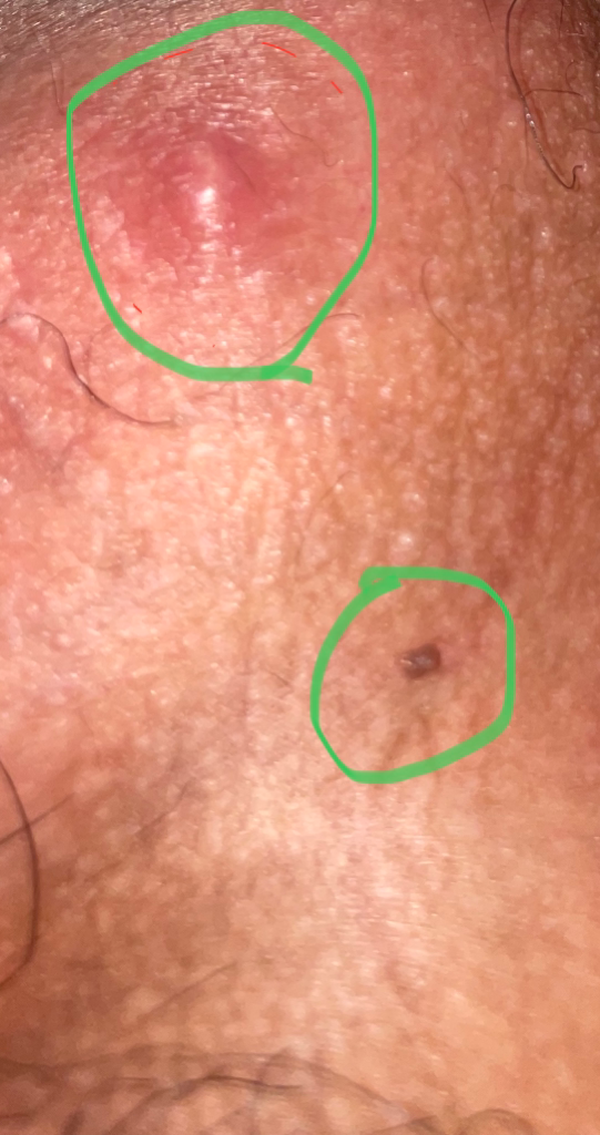 위쪽은 종기 혹은 모낭염, 아래쪽은 모반 혹은 편평 사마귀로 보여집니다.