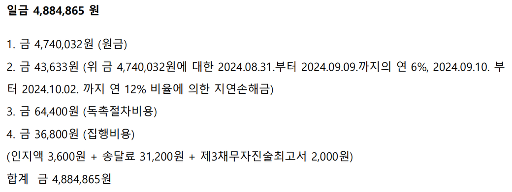 원금 4,740,032원에서 300만원을 차감한 후 남은 원금과 이자, 지연손해금, 독촉절차비용, 집행비용을 합산한 금액이 최종 청구금액이 됩니다.