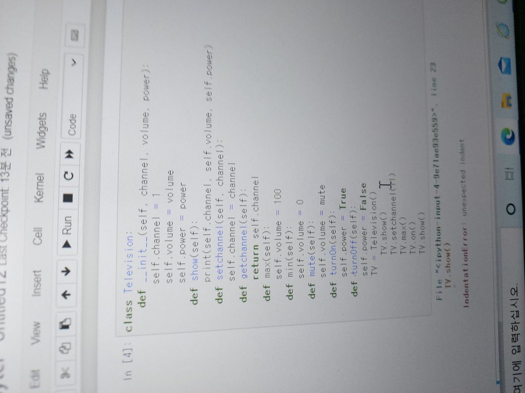 ... (생략) def turnOff(self): self.power = False TV = Television() TV.show() TV.setchannel(11) TV.max() TV.on() TV.show()안녕하세요