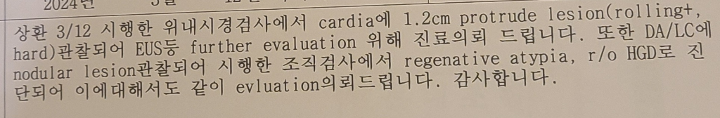 내용이 길게 쓰여져 있지만 핵심적인 부분을 이야기하자면 전암성 병변이 발견되었기 때문에 암과 관련한 진료가 필요하여 상급병원에 가보길 권유한 것 같습니다.