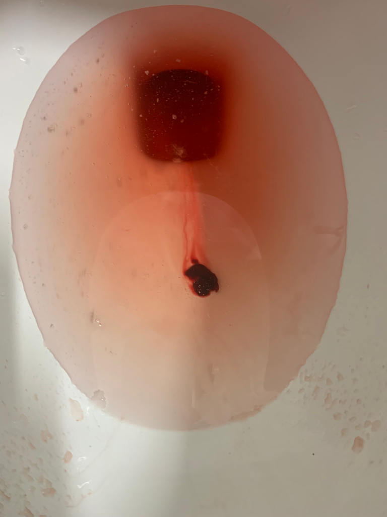 변기를 보면 피와 변기물이 섞여서 변기물에 빨간 물감 탄것처럼 변하긴 하지만 피 덩어리 자체는 물과 희석되지 않고 덩어리로 남아 바닥에 가라앉아 있네요.