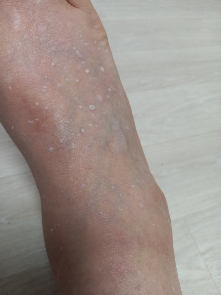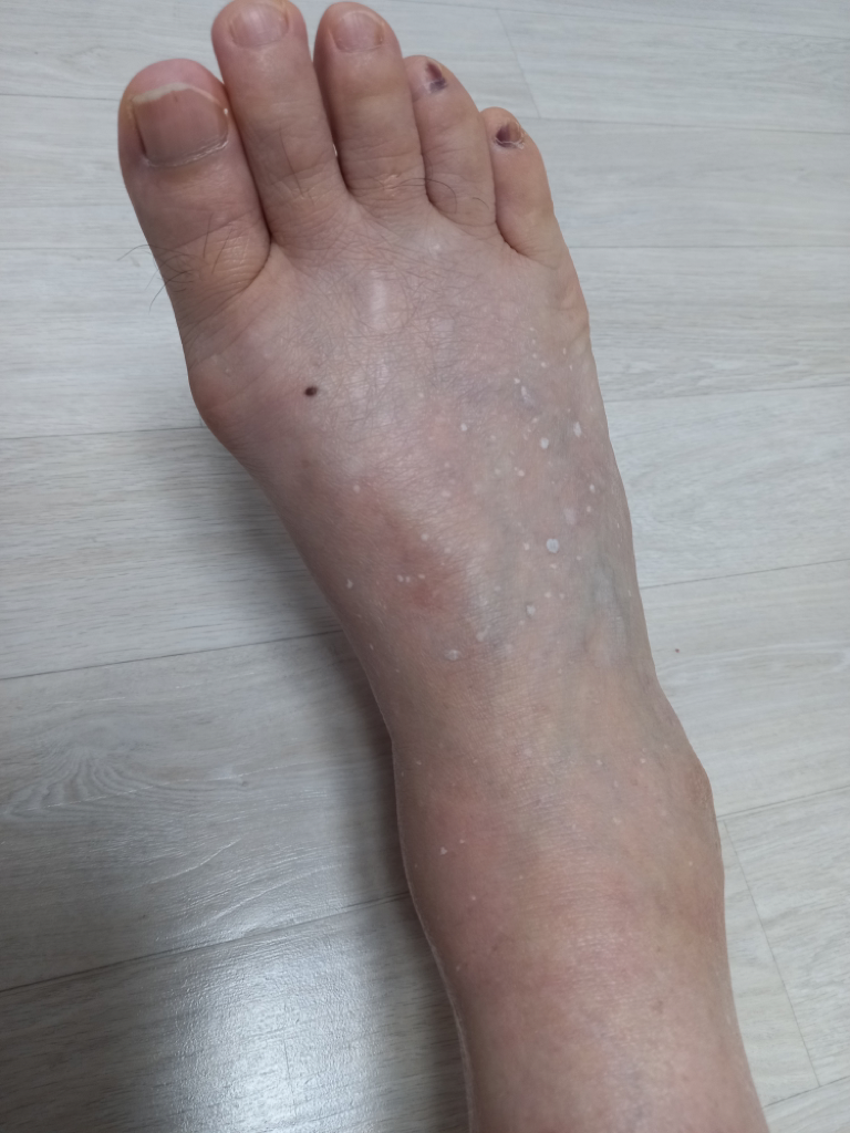 현재 피부 병변은 사진상으로 명확하지 않지만 해당 부위 농포와 유사한 양상을 보이는 것 처럼 보입니다. 해당부위 세균감염등의 가능성을 감별하는 것이 좋을 것 같습니다. 피부과에 내원하시어 진료를 받아보시는 것이 좋겠습니다.