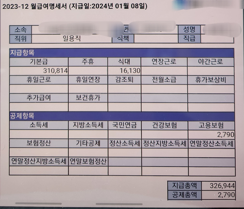 12월 급여표를 보니 일용직으로 되어있더라구요.(하기 이미지)