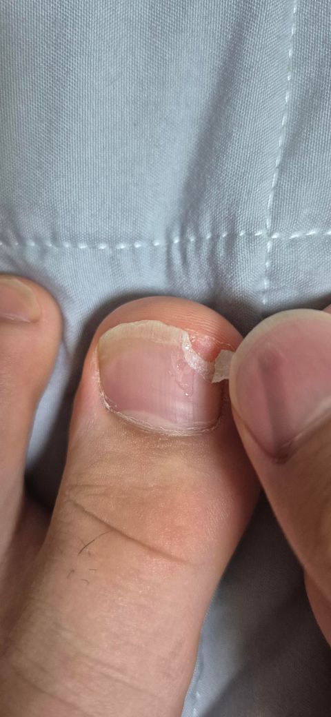 엄지발톱이 1/4 정도 벌어졌지만 (사진상으론 찢어진거 같네요) 통증이 없다면, 급성 외상보다는 일상적인 충격이나 습기에 의한 손상일 가능성이 있습니다. 목욕 후에 피부와 손발톱이 불려진 상태에서는 약해진 발톱이 쉽게 갈라지거나 벌어질 수 있어요. 특히 운동화나 꽉 끼는 신발을 자주 신는 경우, 반복적인 압력으로 발톱 끝이 갈라질 수 있습니다. 이럴 땐 손으로 뜯거나 억지로 제거하지 말고, 벌어진 부위를 깔끔하게 잘라내고 손상된 부분이 옷이나 물체에 걸리지 않게 조심하는 것이 중요해요