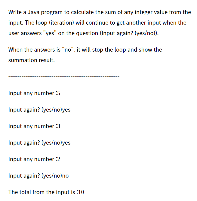 import java.util.Scanner; public class CalculateTest { public static void main(String[] args) { Scanner scanner = new Scanner(System.in); int total = 0; while (true) { System.out.print("Input any number : "); if (scanner.hasNextInt()) { int number = scanner.nextInt(); total += number; } else { System.out.println("Incorrect input: an integer is required"); scanner.next(); continue; } System.out.print("Input again? (yes/no) : "); String line = scanner.next(); if ("yes".equals(line)) { continue; // yes 문자열이 아닌 경우에는 모두 no로 처리 } else { break; } } System.out.println("The total from the input is : " + total); } }