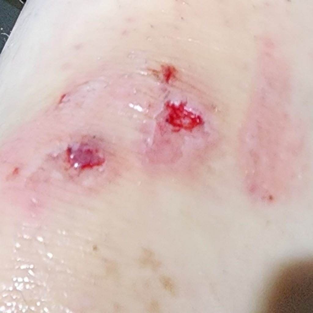 사진으로 판단할 때, 상처 부위가 염증이나 감염의 징후 없이 비교적 깨끗해 보입니다. 일반적으로 이러한 종류의 피부 손상은 가정에서 기본적인 상처 관리를 통해 치료가 가능합니다. 현재 하고 계신 소독 스프레이 사용, 항생 연고인 후시딘을 바르는 것, 그리고 멸균 밴드로 상처를 덮는 것은 적절한 초기 조치입니다. 상처 치료를 위해서는 깨끗하게 유지하고, 밴드는 정기적으로 교체하여 상처가 숨을 쉴 수 있도록 하는 것이 중요합니다. 또한 상처 부위를 잘 관찰하면서 붓기, 심한 통증, 붉어짐, 열감, 고름 등 감염의 징후가 나타나거나 상처가 잘 아물지 않는 경우에는 의료 전문가의 진료를 받는 것이 좋습니다.